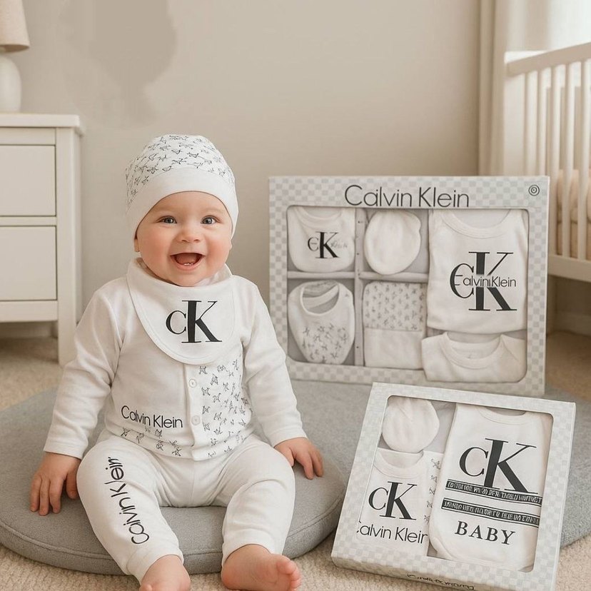 Beyaz örme pamuklu erkek bebek tulumu, uzun kollu, bisiklet yaka ve gri nakış detaylıdır. Calvin Klein markalı, yumuşak ve rahat bir üründür. 7 parça
