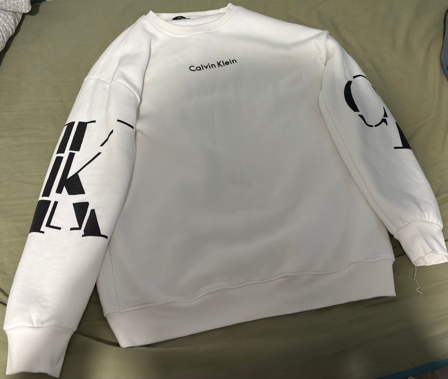 Calvin Klein beyaz sweatshirt, yuvarlak yaka ve uzun kollu, baskılı detaylara sahip. Pamuklu, bol kesim ve rahat bir sokak stili için uygun. Bedeni L