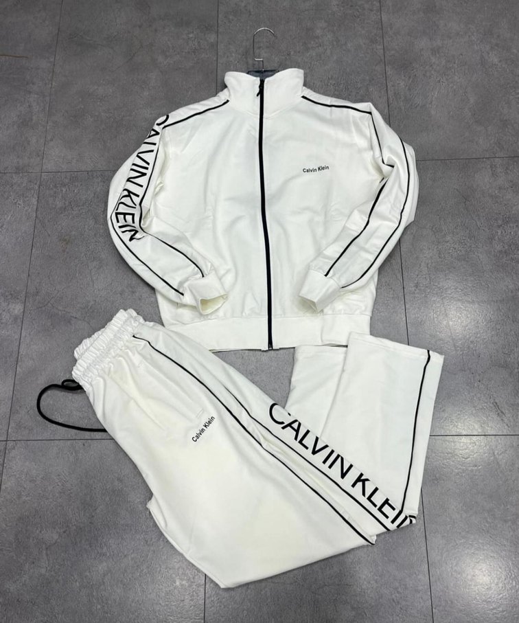 Calvin Klein beyaz fermuarlı erkek eşofman takımı, uzun kollu ve bisiklet yaka. Yumuşak, sıcak kumaştan, rahat kesim ve gri detaylıdır. ♀️ bedenleri mevcuttur