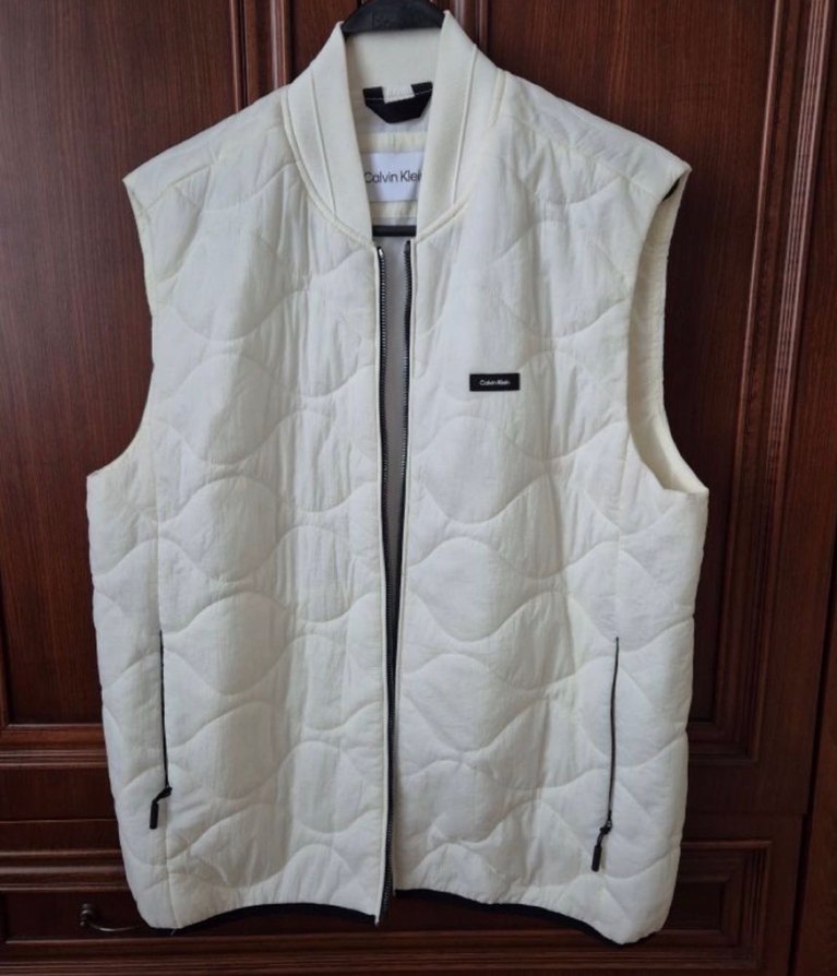 Calvin Klein markalı, beyaz fermuarlı ve yan cepli, kolsuz erkek yelek. Yumuşak ve sıcak kumaştan, regular fit ve askısız yakalı, günlük kullanıma uygun.
