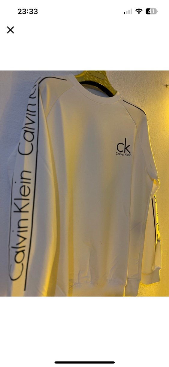 Calvin Klein beyaz pamuklu erkek sweatshirt, uzun kollu, yuvarlak yaka ve bol kesim. Kollarında baskılı marka yazısı ve fermuar detaylıdır. Günlük kullanıma uygundur.