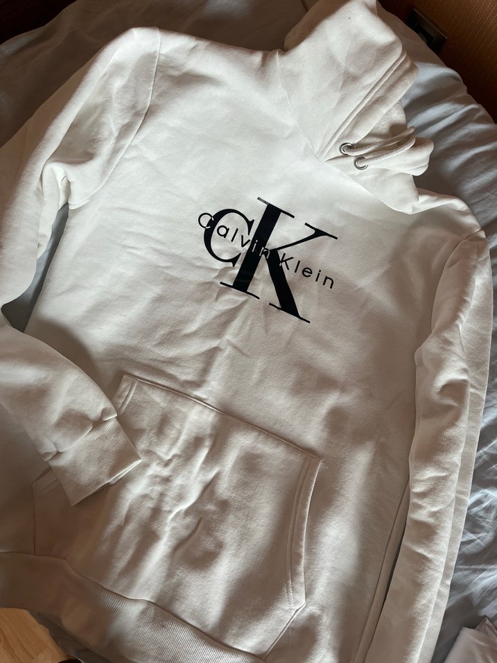 Burusuk olduğu için böyle gözüküyor.Uzun kollu, bol kesim beyaz pamuklu sweatshirt. Bisiklet yaka, fermuarlı detay ve Calvin Klein baskılı. Günlük kullanım için rahat. Orj değil