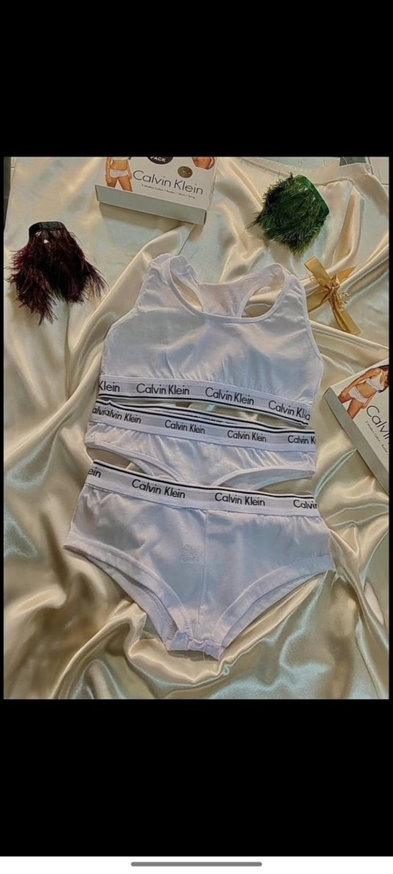 Calvin Klein marka beyaz, kısa kesim spor sütyen ve külot takımı, rahat ve şık elastik bant detaylarıyla athleisure tarzında.