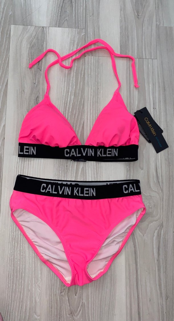 Kalın elastik bantlarda Calvin Klein logosu bulunan, kısa mini kesim ve askılı pembe bikini takımı. Baskılı kumaş ve fit kesim, cesur bir sokak stili sunar.