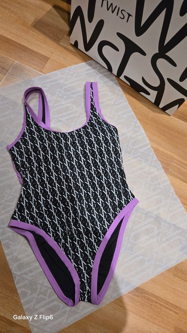 CALVİN KLEİN Mor kenarlı, siyah zemin üzerine beyaz logo desenli, strappy kollu, vücuda oturan kadın mayosu. Spor ve şık bir tasarım sunar. Etiketli.ORJİNALDİR.