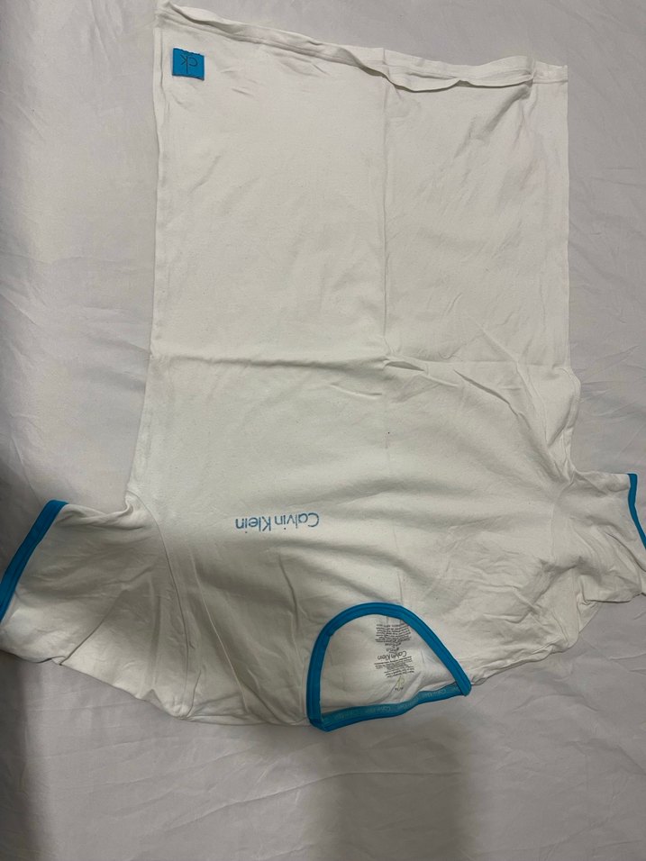 Calvin Klein erkek beyaz slim fit atlet, normal midi uzunlukta, kol ve logoda gri-mavi detaylarla minimalist tasarım sunar.