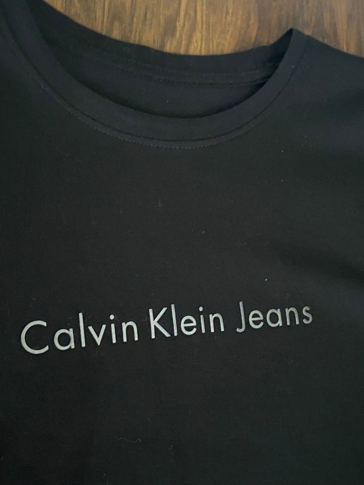 Siyah tişört, yuvarlak yaka ve kısa kolludur. Sentetik kumaştan yapılmış, üzerinde Calvin Klein Jeans baskısı bulunur. S beden ve hiç giyilmedi kapattığımız butiğimizden kalan ürünlerdendir.