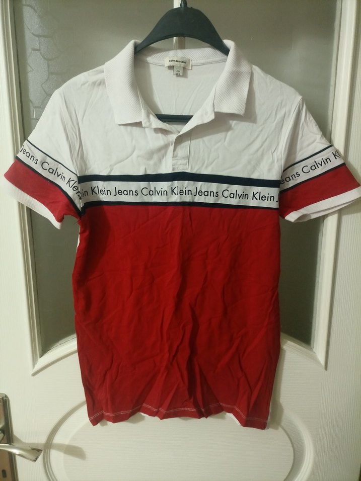 Fitted kesim, kısa kollu, düğmeli yakalı erkek polo tişört. Pamuklu kırmızı ve gri renklerde, Orijinal Calvin Klein baskılı, günlük ve sokak stiline uygun.