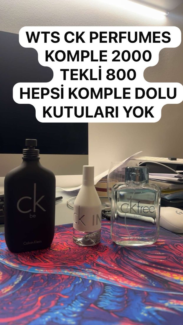 Minimalist gri ve beyaz şişelerde üç adet Calvin Klein erkek parfümü. Kutusuz, tam dolu ve tekli veya set halinde satılır.
