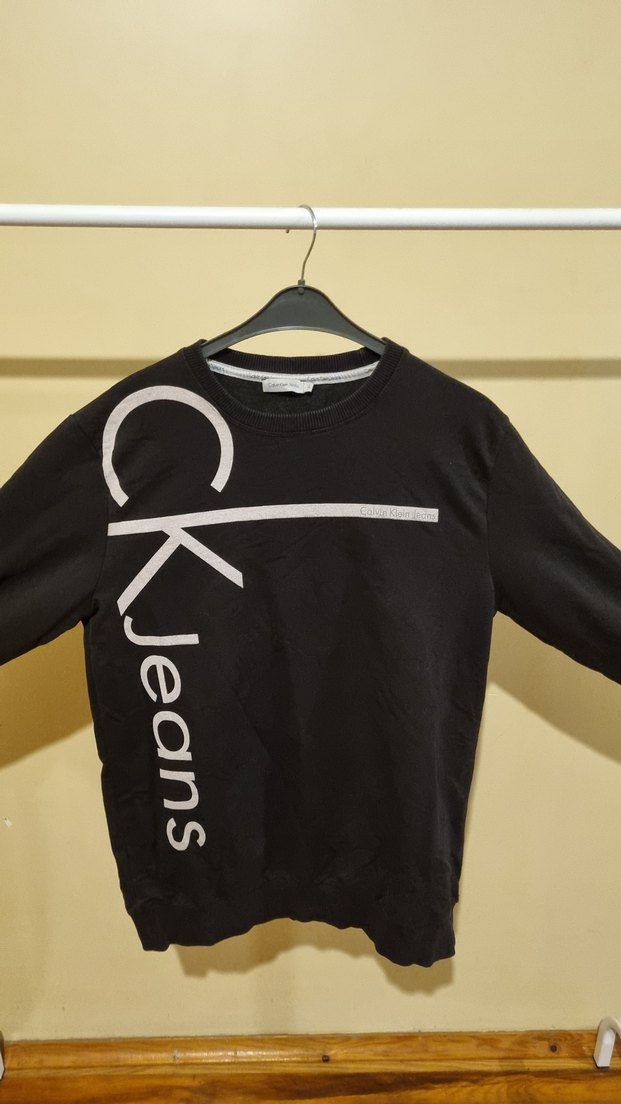 Siyah renk, uzun kollu, bisiklet yaka ve pamuklu örme kumaştan yapılmış erkek sweatshirt. Baskılı CK Jeans logosu ile rahat bir kesime sahiptir.