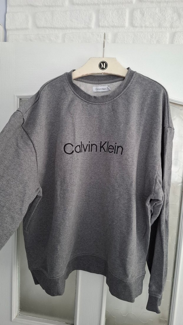 Calvin Klein gri sweatshirt, yuvarlak yaka ve uzun kollu, bol kesim. Yumuşak pamuklu, baskılı logo ve örme dokusu ile günlük sokak stili için uygundur.