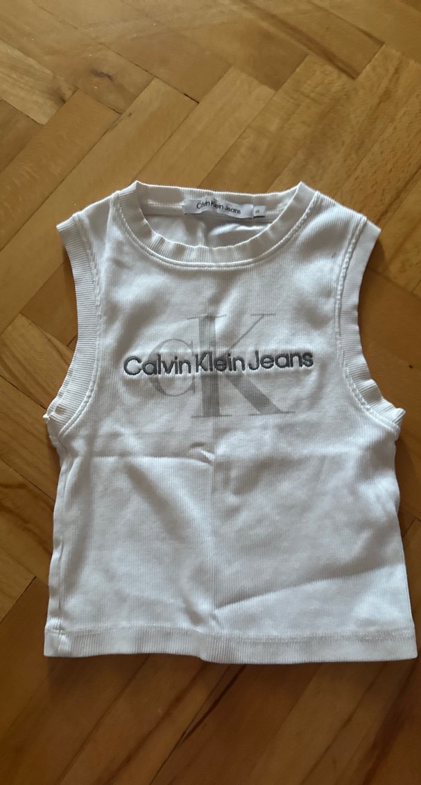 Beyaz atlet, gri baskılı Calvin Klein Jeans logosu ile yumuşak kumaştan üretilmiştir. Xs beden kadın