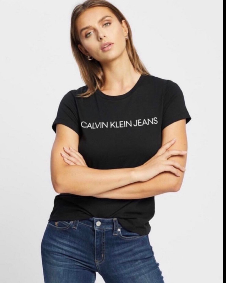 Dar kesim, kısa kollu siyah denim tişört, yuvarlak yaka ve "CALVIN KLEIN JEANS" baskısıyla rahat ve şık bir sokak stili sunar. Günlük kullanıma uygundur.