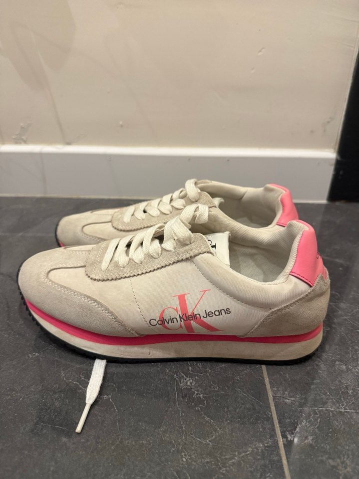 Calvin Klein Jeans spor ayakkabı, düz kauçuk taban, baskılı logo ve gri pembe renklerin şık birleşimi. Spor ve günlük kullanım için uygun.