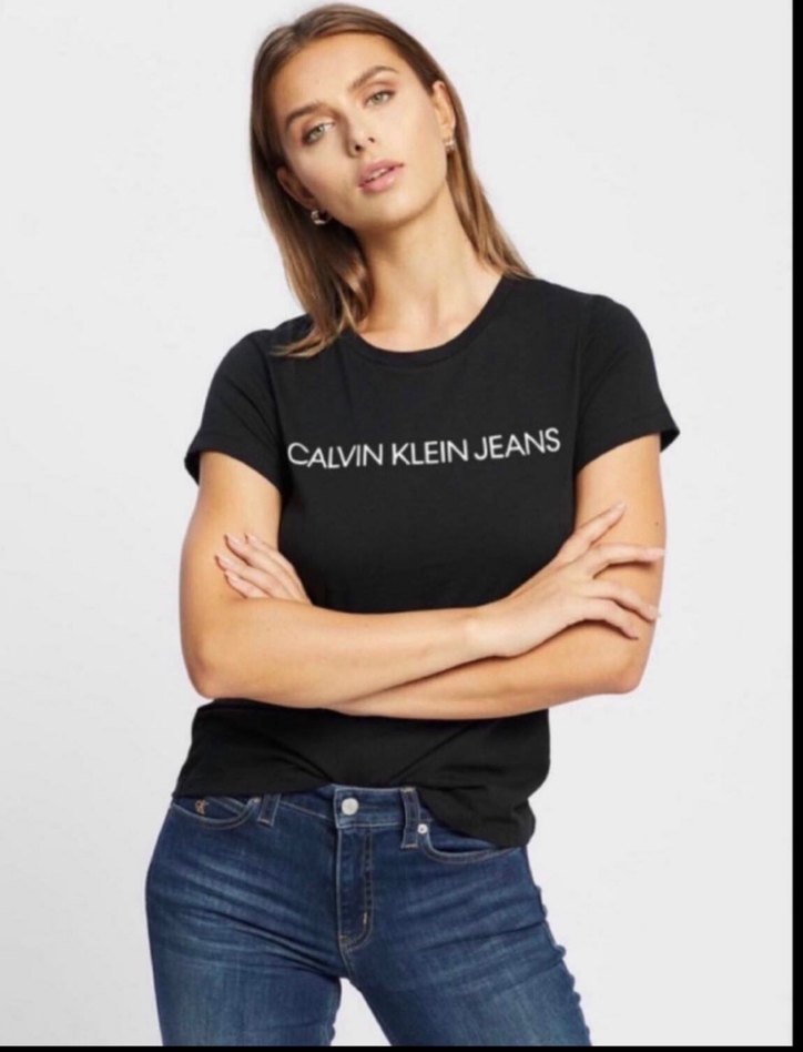 Calvin Klein Jeans baskılı, siyah, kısa kollu, bisiklet yaka ve fitted kesimli denim tişört. S beden sıfır etiketli