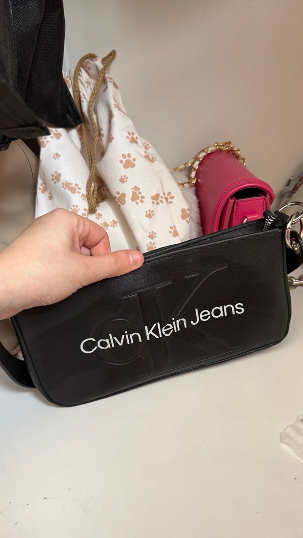 Calvin Klein Jeans marka siyah deri çanta, baskılı desene ve fermuarlı kapanışa sahiptir. Günlük sokak stili için uygundur.