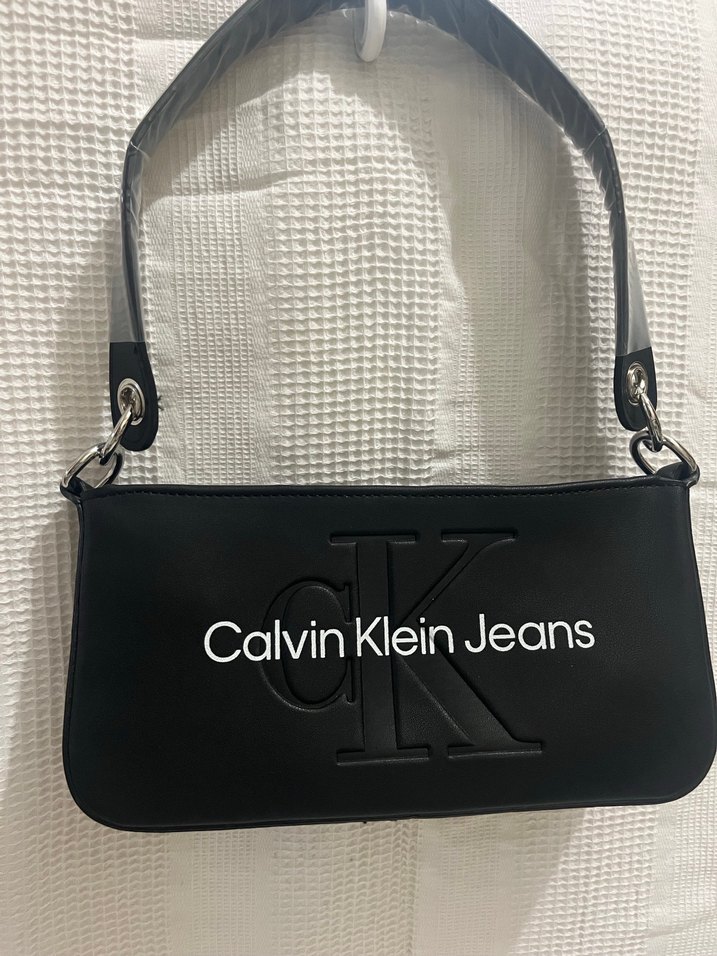 Calvin Klein markalı siyah deri çanta, baskılı logo ve fermuarlı kapama özelliğiyle günlük şık kullanım için uygundur.