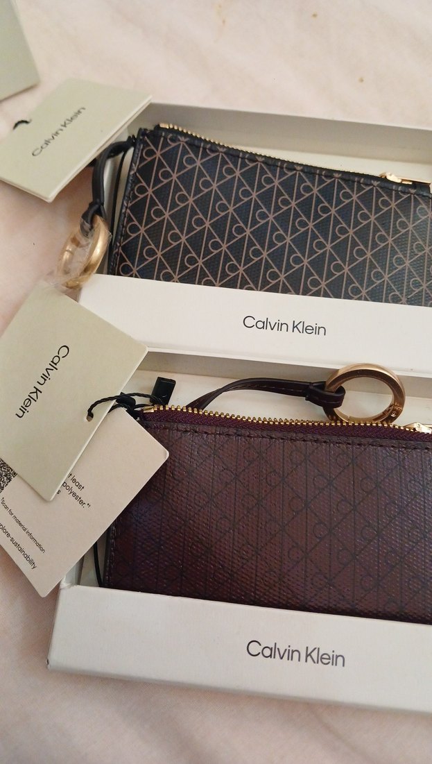 Calvin Klein markalı, baskılı desenli koyu kahverengi deri kadın cüzdan. Fermuarlı kapanışı ve çağdaş tarzıyla günlük kullanıma uygundur.