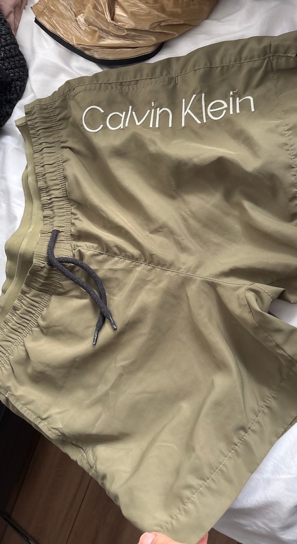Calvin Klein marka, kahverengi, belden kemerli, bol kesim midi şort. Parlak dokusu ve sade tasarımıyla outdoor kullanım için uygundur. 42 cm bel 38 cm boy