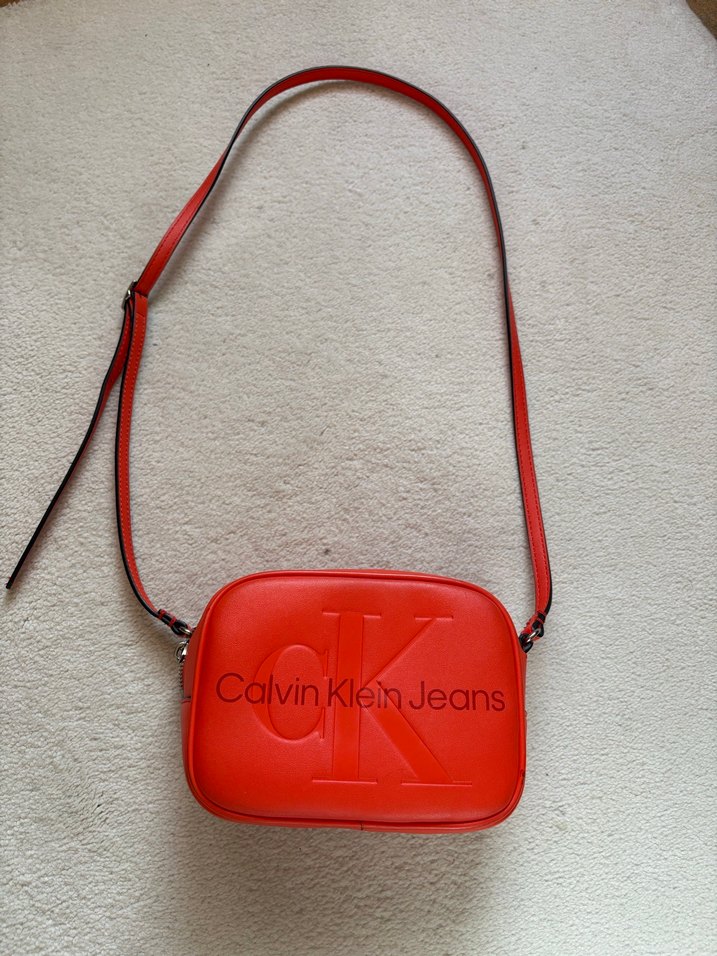 Calvin Klein kırmızı deri çapraz çanta, kemerli askı ve kabartma logo detayına sahiptir, trend sokak stiline uygundur. Orjinal temiz