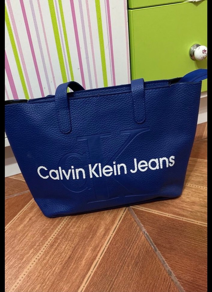 Calvin Klein mavi deri kadın çanta, renkli baskılı desen ve fermuarlı kapama ile sokak tarzına uygun. 1 defa tek takıldı