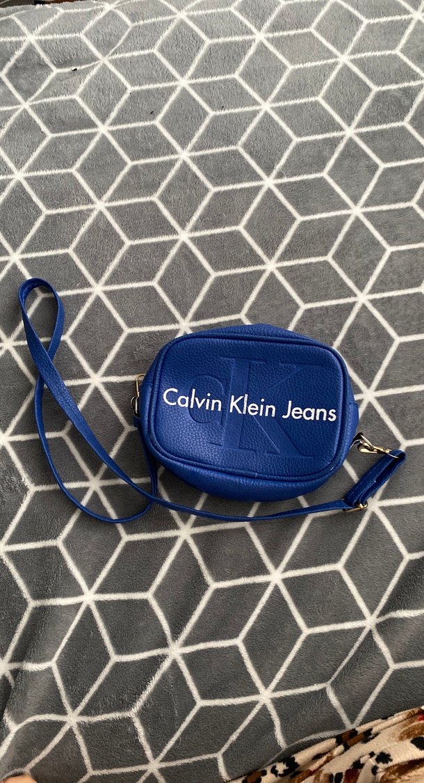 Calvin Klein markalı, canlı mavi deriden yapılmış, baskılı kemer detayı bulunan kadın çapraz çanta. Günlük kullanım için şık ve kompakt tasarım.