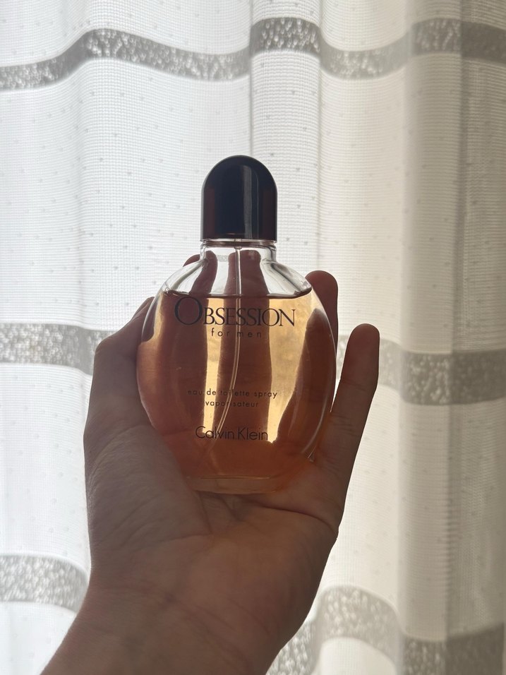 Calvin Klein Obsession erkek parfümü, siyah kapaklı şeffaf şişede. Sıcak ve yoğun koku deneyimi sunar. Orjinaldir birkaç kere kullandım