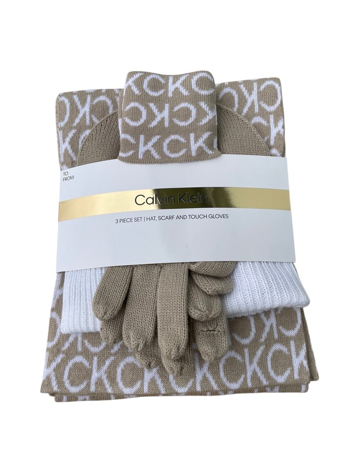 Amerika’dan alındı etiketli ürün ️ Orijinal ve Faturalıdır. İsteyenlere ayrıntılı video ve fotoğraf gönderebilirim Calvin Klein markalı, bej renkli örgü eldiven, bere ve atkı seti, gri CK desenli, yumuşak sentetik kumaştan, trend günlük stil için uygun.