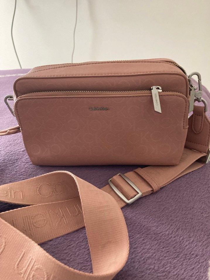 Calvin Klein orjinal Pudra pembesi deri çapraz çanta, minimal ve pastel tonlarda. Günlük kullanım için uygun, desen içermeyen şık bir modeldir. 22x14x6 cm