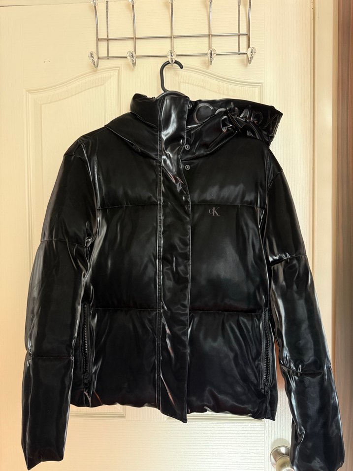 Parlak siyah kapişonlu şişme mont 3-4 kez giyilmiştir