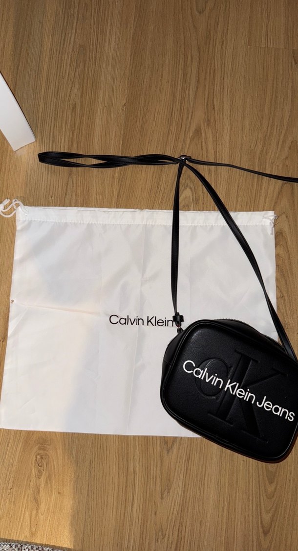 Calvin Klein'in siyah deri çapraz çantası, baskılı logo ve bel detayına sahip, minimalist sokak stiline uygun bir modeldir. Orijinal üründür