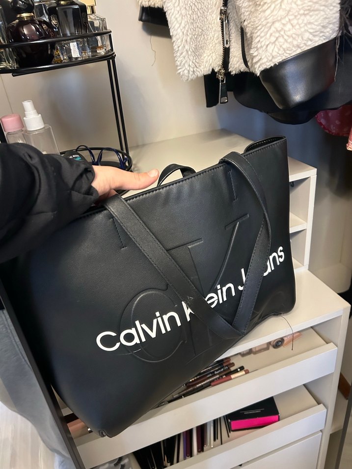 Siyah deri çanta, fermuarlı ve üzerinde baskılı Calvin Klein logosu bulunur. Trendy casual ve iş kullanımı için uygundur.
