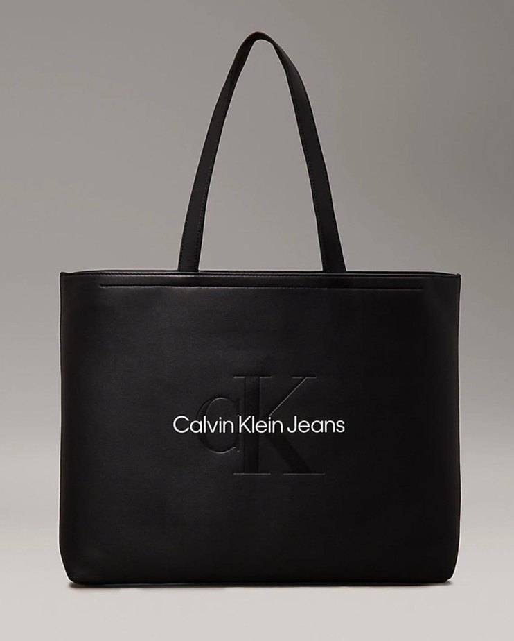 Calvin Klein'in siyah deri kadın çantası, fermuarlı kapama ve baskılı logo ile minimalist sokak stiline uygundur.