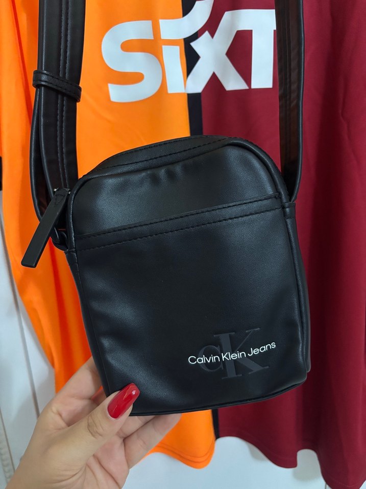 Fermuarlı siyah deri çapraz çanta, üzerinde Calvin Klein Jeans baskısı bulunur. Günlük kullanım için uygun, trend sokak stiline uyumlu.