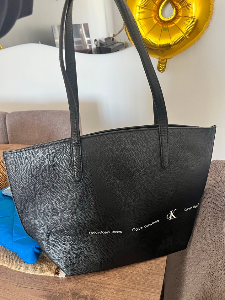 Siyah deri kadın omuz çantası, baskılı Calvin Klein Jeans logosu ve fermuarlı kapanışa sahip, günlük kullanım için uygun. Alt kısımlarında küçük aşınmalar mevcut.