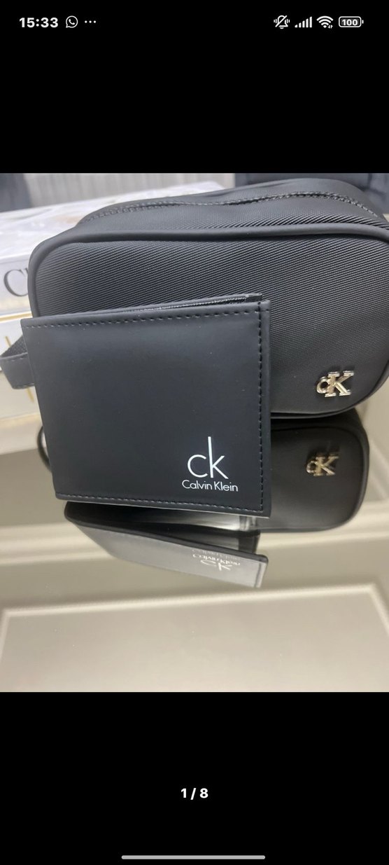 Calvin Klein markalı siyah erkek cüzdan, baskılı logo ile iş ve sokak stili arasında şık bir görünüm sunar. Günlük kullanım için ideal, koyu renkli tasarım.