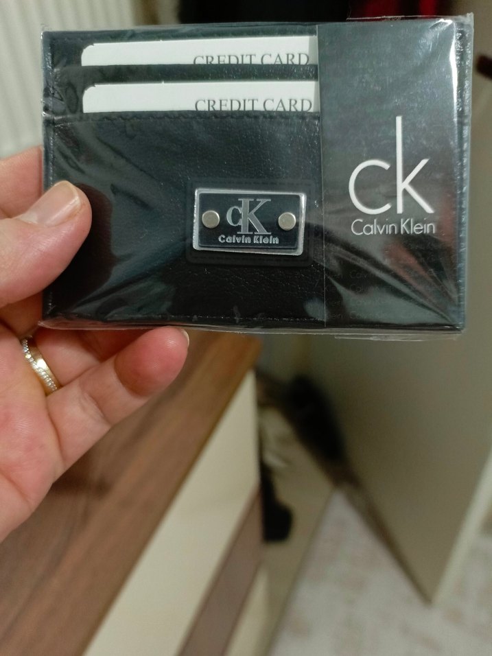 Calvin Klein marka siyah erkek cüzdanı, baskılı desen ve çoklu kart yuvalarına sahiptir. Önünde metal logo plakası bulunur.