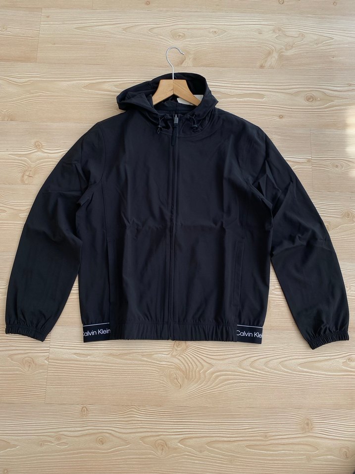 Calvin Klein siyah erkek rüzgarlık, uzun kollu ve fermuarlı. Yumuşak fleece kumaştan, notched lapel yaka ve kapüşonlu. Günlük kullanıma uygun midi boyda.