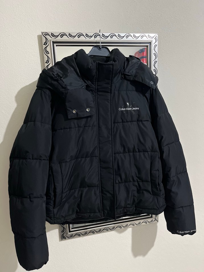 Calvin Klein siyah mont, yüksek yakalı ve fermuarlı. İnce kesim, normal boy ve uzun kollu, dış mekan için uygun, trend rahat tarzda. Sadece bir kere giydim.