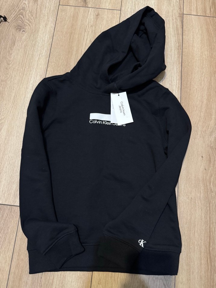 Calvin Klein siyah sweatshirt, uzun kollu ve baskılı logolu. Dar kesim, yuvarlak yaka ve rahat tüylü kumaş içerir.