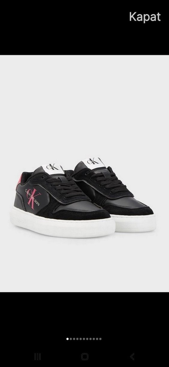 Calvin Klein kadın spor ayakkabısı, platform topuklu ve koyu pembe batik desenli, kauçuk tabanlıdır. Trendy günlük kullanım için cırt cırt ve bağcıklı.