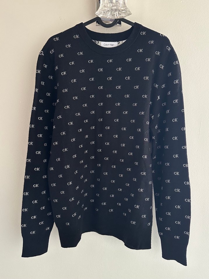 Erkek siyah, uzun kollu, yuvarlak yakalı örgü kazak. Yün malzemeden, bol kesim ve CK logosu desenli, rahat ve sıcak tutar.