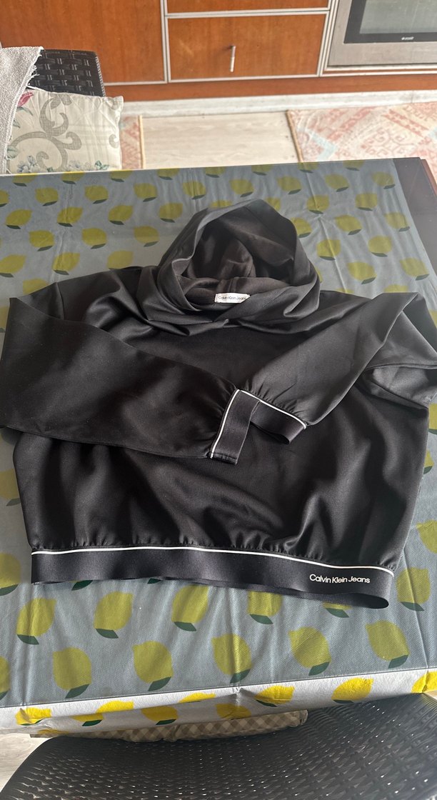 Calvin Klein siyah sweatshirt, yüksek yakalı ve uzun kollu, bol kesimdir. Sentetik kumaştan, drapeli ve gri detaylıdır. Günlük kullanım için uygundur. Hiç giyilmedi orjinal ürün