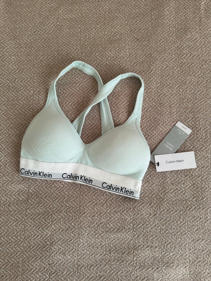 Turkuaz tonlarında Calvin Klein spor sütyeni, baskılı logo bantlı ve çapraz sırt detaylıdır. ️♀️