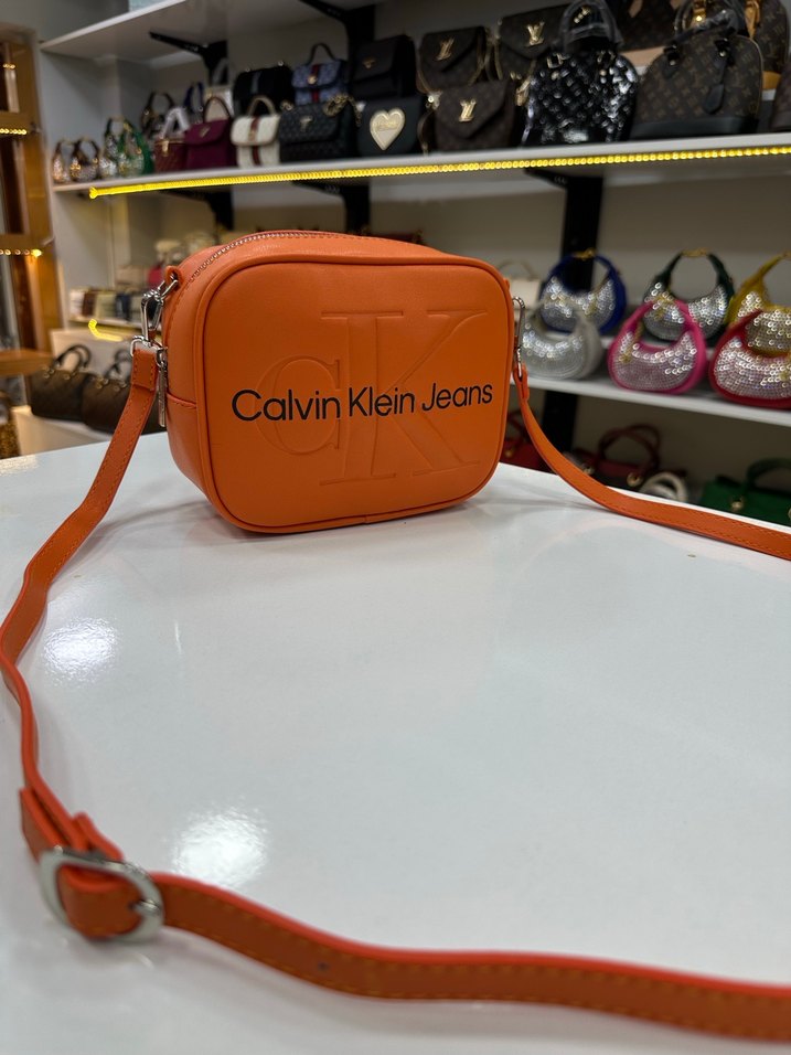 ⚜️İhracat Fazlası ürün, Elimde Yüksek adetli olduğu için uyguna Satıyorum⚜️ Calvin Klein turuncu deri çapraz çanta, baskılı logo ve kemerli askıya sahip, sokak stili ve günlük kullanım için uygun.