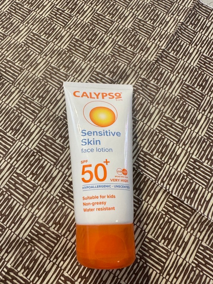 Calypso SPF 50+ yüz losyonu, çok yüksek koruma sağlar, yağlı his bırakmaz, suya dayanıklıdır ve hassas cilt ile çocuklar için uygundur.