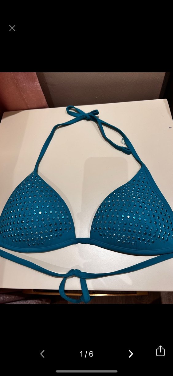 Turkuaz renkli, ışıltılı payetlerle süslenmiş, ipli ve vücuda oturan bikini üstü. Plajda göz alıcı bohem tarzı sunar. Minik bir söküğü var belli olmuyor
