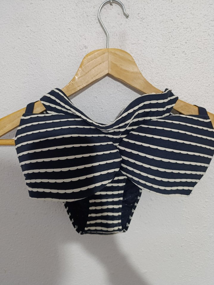 Lacivert zebra desenli, pliseli detaylara ve askılı kollara sahip, vücuda oturan kısa mini bikini. Plajda ve sokak stilinde rahat kullanılır.