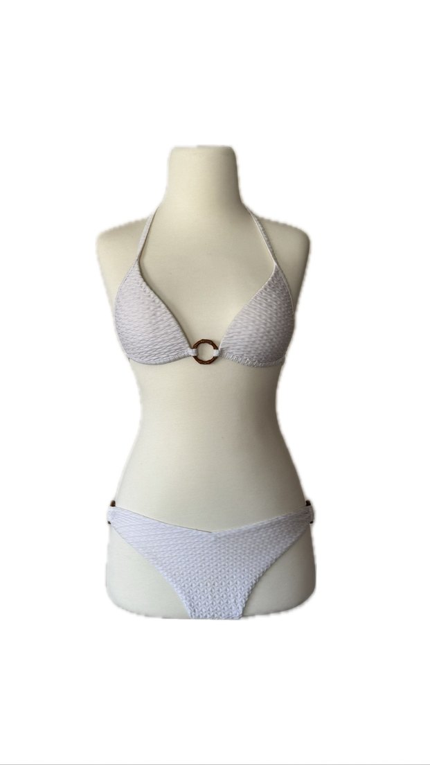 Beyaz renkli, askılı ve bohem tarzda vücuda oturan bikini. Minimalist ve zahmetsiz şıklık. Bir kez giyildi.