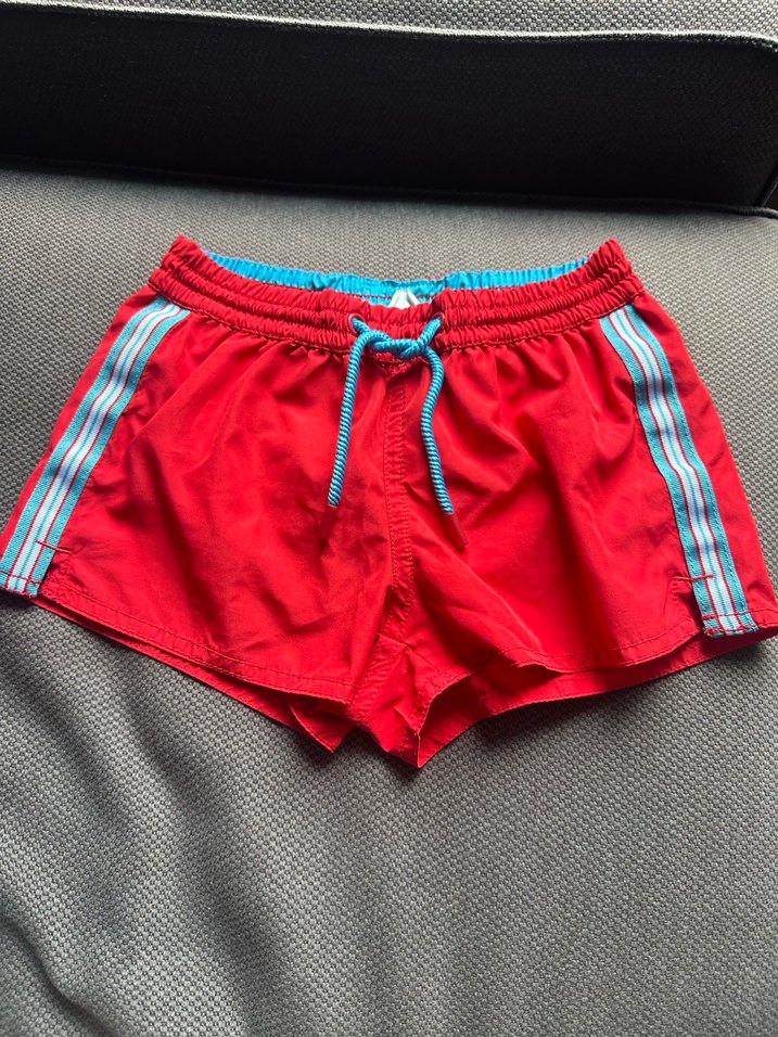 Kırmızı renkli, yanları mavi şeritli ve ayarlanabilir bağcıklı erkek çocuk deniz şortu. Hafif ve çabuk kuruyan kumaştan üretilmiştir. Calzedonia marka.